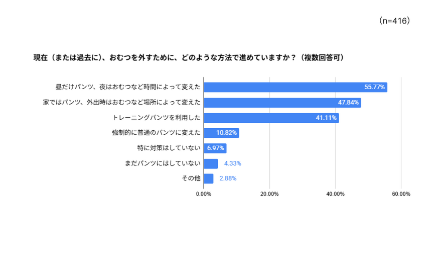 どうやっておむつを卒業したか、より具体的な方法についても調査しました。1位は「昼だけパンツ、夜はおむつなど時間によって変えた(55.77%)」、2位は「家ではパンツ、外出時はおむつなど場所によって変えた(47.84%)」と、時間帯や場所でパンツとおむつを切り替えるという方が多い結果になりました。「まもなく4歳になる下の子の夜のオムツがなかなか外れない。夜はコントロールが出来ないから声がけも難しい。自然と減ってくるのを気長に待つしかないのかなぁと…」「トイトレ中、一番困ったのは外出先でのトイレ。補助便座や踏み台のないトイレでは、上手くできないことも多いので、どうしてもオムツに頼ってしまいました。」など、夜間や外出先でのトイトレに苦労された方も多いようです。