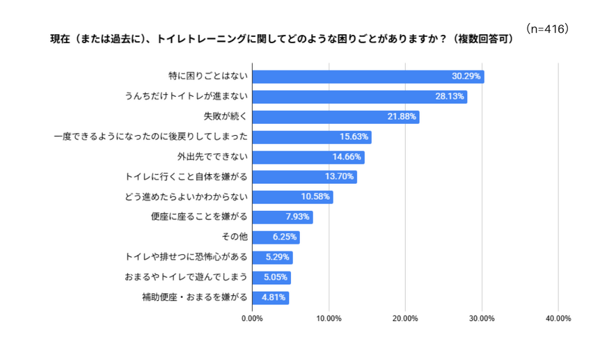 そのほかの困りごとに関しても調査しました。「特に困りごとはない」と回答された方も3割いらっしゃいましたが、7割の方は何らかの困りごとを抱えている(抱えていた)ようです。特に目立ったのが、 2位の「うんちだけトイトレが進まない(28.13%)」でした。「トイレに座ってりきむのが難しかったみたいで、いつもオムツにうんちをしていて、トイレでできるようになるまで、少し時間がかかった。」「うんちが怖い、臭いと子供ながらにマイナスなイメージを持っているからか、うんちのトイトレが進まなかったです」といった声が、自由回答にも多く寄せられました。前述した記事でもこのお悩みを取り上げています。専門家の先生によると、「便器に座った時に足がぶらぶらしていて踏ん張れない、おしりからうんちが落ちる感覚を不安に感じる、単純におむつでしたいなど、そこには子どもなりの理由が存在している」とのこと。様々な理由があり、よく聞かれるお悩みのようですので、「うちだけかな」と気にせずに、お子さんの体のためにも、トイレでなくてもうんちが出ることをゴールにして見守ってみてください。また、このランキング以外には、「おしりを拭くのが難しい」というコメントも複数見られました。