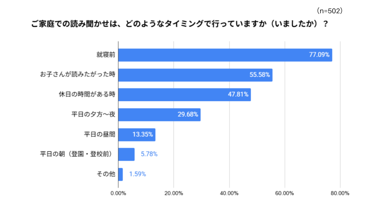ご家庭での読み聞かせをどのようなタイミングで行っているかについては、「就寝前」が77.09%と圧倒的に多く、次いで「お子さんが読みたがった時」が55.58%、「休日の時間がある時」が47.81%と続きました。多くのご家庭で、1日の終わりの入眠儀式や、親子のリラックスタイムとして読み聞かせが定着しているようです。