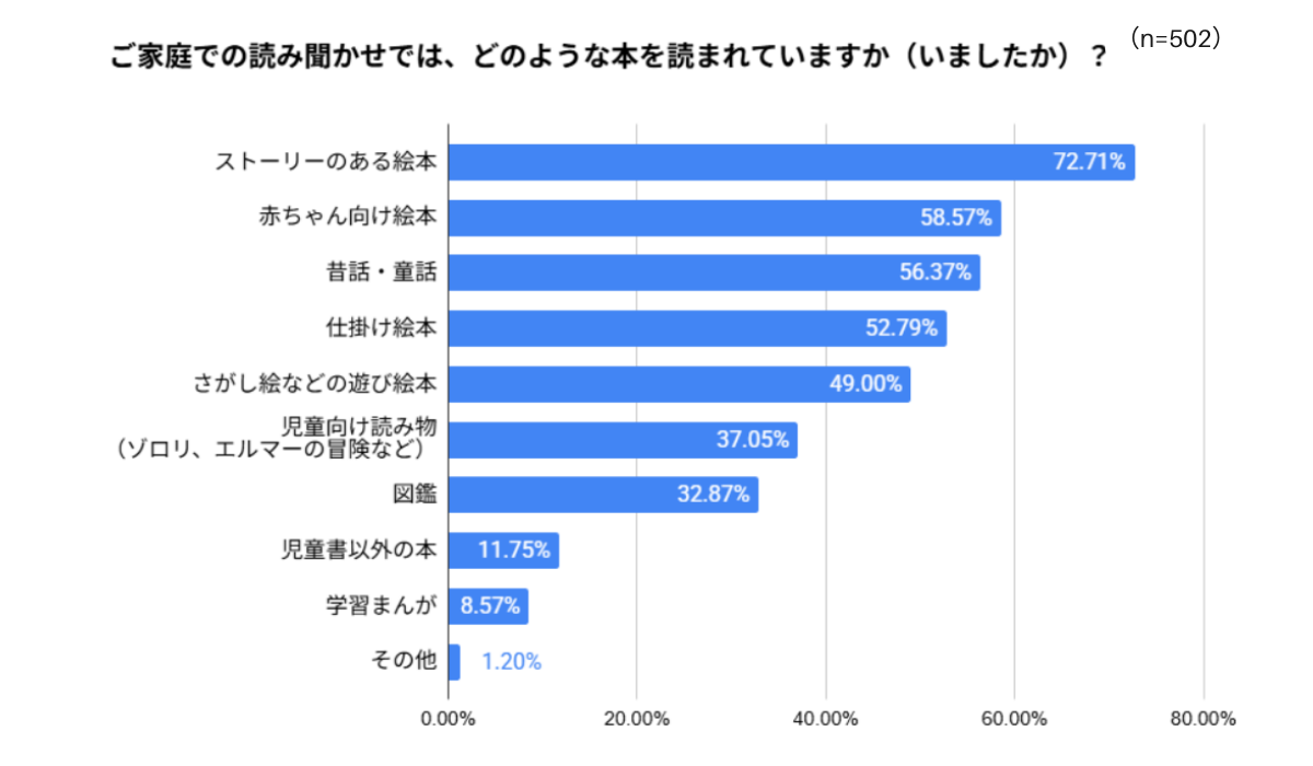 どのような本を読んでいるかという質問では、「ストーリーのある絵本」が72.71%で最も多く、次いで「赤ちゃん向け絵本」が58.57%、「昔話・童話」が56.37%、「仕掛け絵本」が52.79%という結果になり、年齢や成長に合わせて多様な絵本が楽しまれていることがわかりました。
