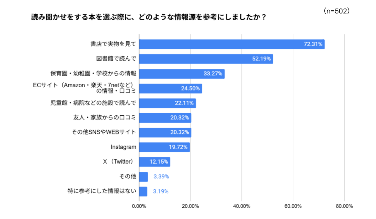 読み聞かせをする本はどのように選んでいるのでしょうか。情報源として最も多く活用されているのは「書店で実物を見て」の72.31%で、第2位は「図書館で読んで」の52.19%となっており、「保育園・幼稚園・学校からの情報」の33.27%や「ECサイト(Amazon・楽天・7netなど)の情報・口コミ」の24.50%を上回り、実際に本を手に取って子どもとの相性や内容を確認したいというニーズが根強いことが伺えます。