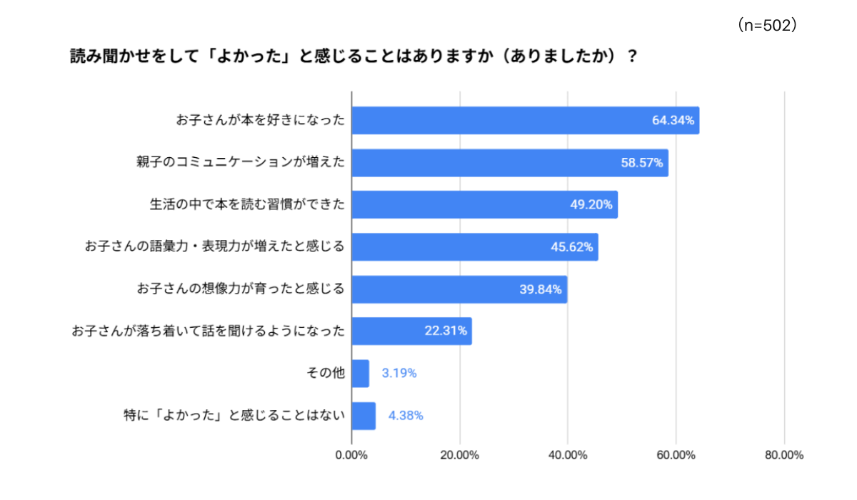 大変なことも多い読み聞かせですが、メリットを感じた方も多くいらっしゃいました。読み聞かせをしてよかったこととしては「お子さんが本を好きになった」が64.34%と最も高く、「親子のコミュニケーションが増えた」が58.57%、「生活の中で本を読む習慣ができた」が49.20%、「お子さんの語彙力・表現力が増えたと感じる」が45.62%、「お子さんの想像力が育ったと感じる」が39.84%と続きました。