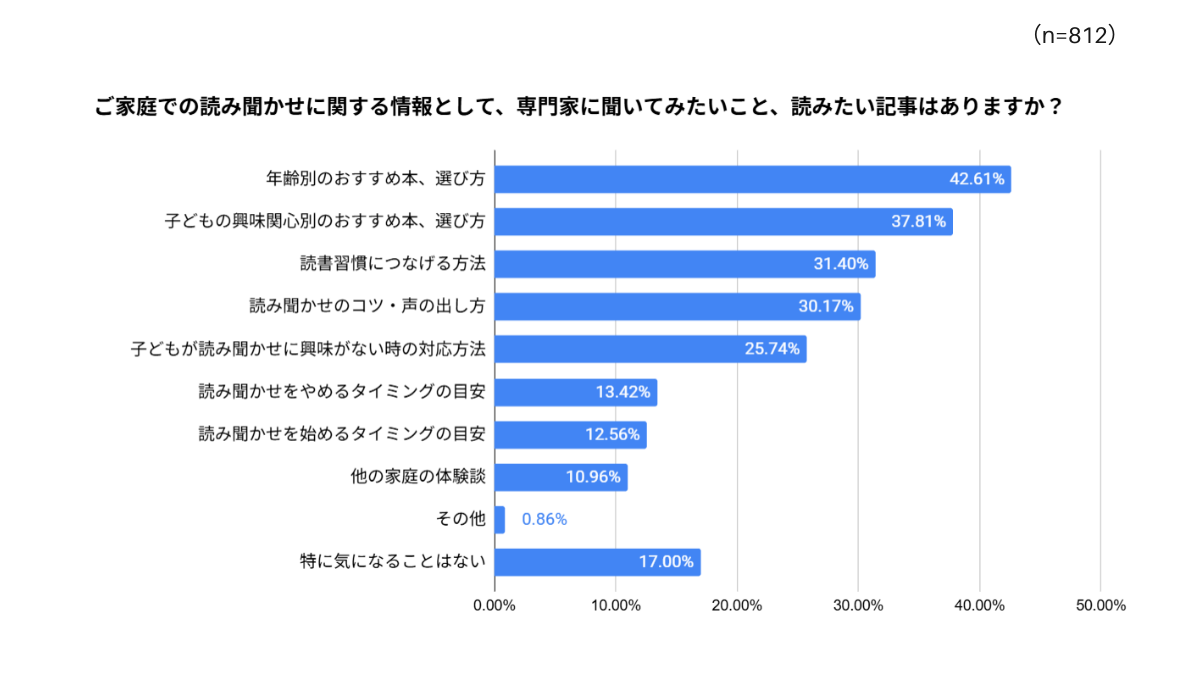 最後に、ご家庭での読み聞かせに関する情報として専門家に聞いてみたいことや読みたい記事について伺いました。結果は「年齢別のおすすめ本、選び方」が42.61%でトップとなり、次いで「子どもの興味関心別のおすすめ本、選び方」が37.81%と、どんな本を選んだらいいのか、オススメの本を知りたいという方が多数いらっしゃいました。