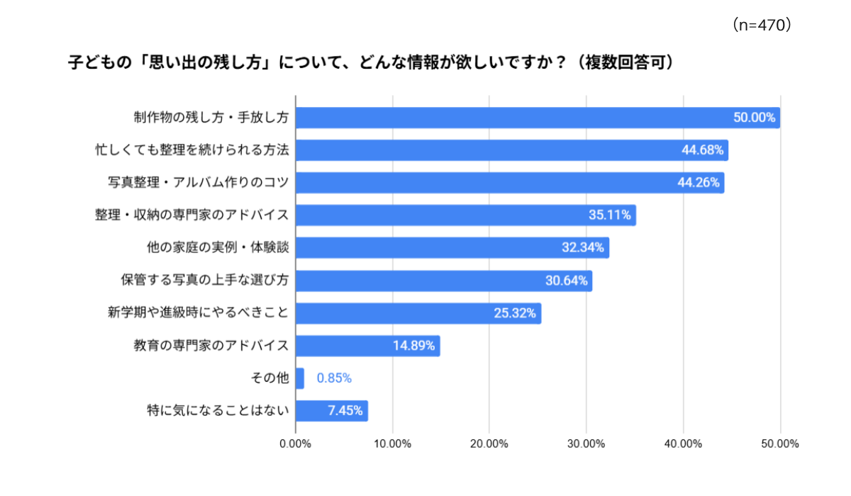 子どもの「思い出の残し方」についてどんな情報が欲しいかも調査しました。最も多かったのは「制作物の残し方・手放し方」で50.00%でした。次いで「忙しくても整理を続けられる方法(44.68%)」、「写真整理・アルバム作りのコツ(44.26%)」が続き、上手く整理しながら何とかお子さんの思い出を手元に残したいという親御さんの気持ちが伺えました。