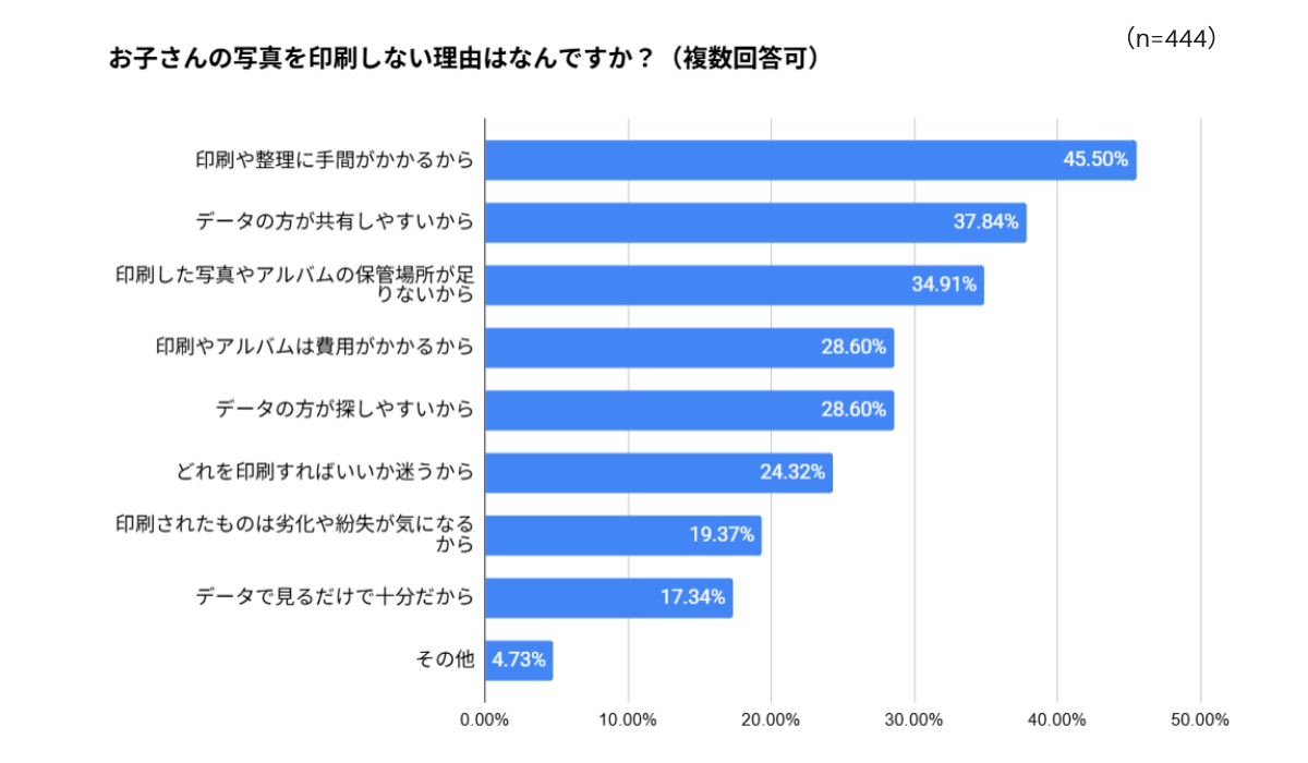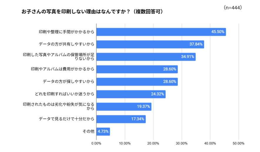 一方、写真を印刷しない理由としては、「印刷や整理に手間がかかるから(45.50%)」が最も多く、次いで「データの方が共有しやすいから(37.84%)」、「印刷した写真やアルバムの保管場所が足りないから(34.91%)」、「印刷やアルバムは費用がかかるから(28.60%)」といった理由が挙げられています。自由回答を見ても、「写真をたくさん撮るので、印刷するのに時間がかかり追いついていない。良い写真のみを印刷するようにしていますが、その場合子供の色々な場面を思い出に残せないと思うと少し悲しさがあります。」「0歳の時は育休中で少し余裕があり、写真を印刷したり、写真館に行ったりできていたが、仕事を開始してからそのような余裕もなく…。気軽に記念写真っぽくなるしくみなどあると良いなと思います。」など、理想と現実のギャップに悩む声は多く寄せられました。