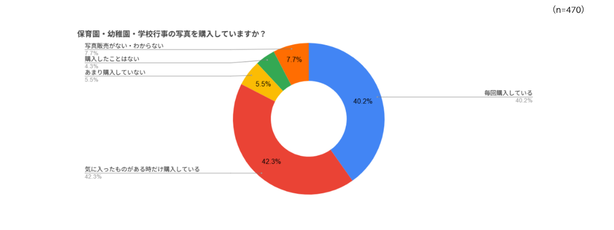 園や学校での行事の写真販売についても調査してみました。「毎回購入している」が40.2%、「気に入ったものがある時だけ購入している」が42.3%と、合計で8割以上の方が購入経験があることがわかりました。理由についても見ていきましょう。