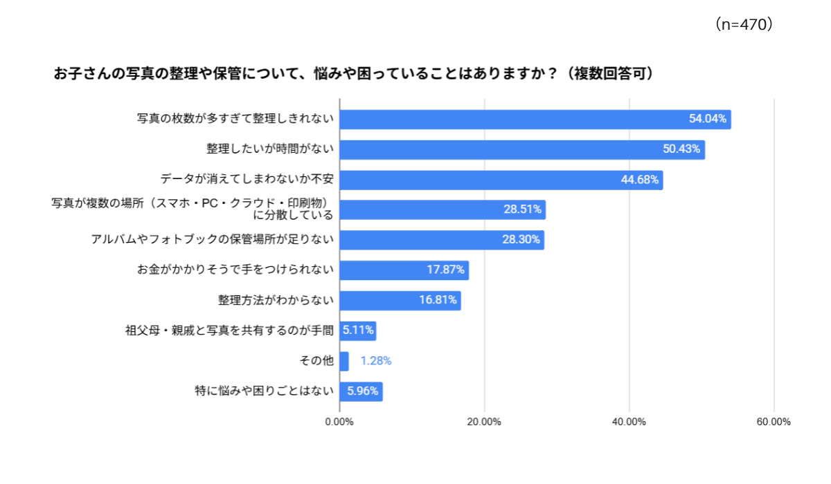 写真の整理や保管についての悩みを聞くと、トップは「写真の枚数が多すぎて整理しきれない」で54.04%、僅差で「整理したいが時間がない」が50.43%となりました。3位以降にも「データが消えてしまわないか不安(44.68%)」、「写真が複数の場所に分散している(28.51%)」、「アルバムやフォトブックの保管場所が足りない(28.30%)」といった回答が続き、94%の方が何らかの悩みを抱えていることがわかりました。自由回答でも、「前の携帯からの写真データが引き継がれていてかなりの量があり、もはや整理する時間もなくて大変困っています。」という切実な声や、「子どもが生まれてからスマホ内の写真が増え、無料分のクラウド容量をあっという間に越えました。買い増ししていますが、それも満杯になりそうです。」と、デジタルならではの容量不足に直面しているエピソードも寄せられました。他にも非常に多くのお悩みが寄せられましたが、共通しているのは「どうにか子どもの思い出を残しておきたい」という気持ち。「幼い頃の思い出はせめて写真にしてでも残しておきたいです。二度とその頃には戻れないので。」という温かいコメントも寄せられました。