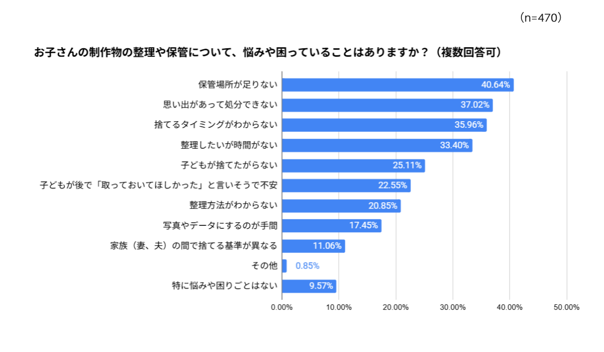 制作物の整理や保管における具体的な悩みは、「保管場所が足りない」が40.64%でトップでした。次いで「思い出があって処分できない(37.02%)」、「捨てるタイミングがわからない(35.96%)」、「整理したいが時間がない(33.40%)」など、整理したいと思いつつ、感情的にためらわれたり、忙しくてできない、という方が多くいらっしゃいました。また、「子どもが捨てたがらない(25.11%)」、「子どもが後で『取っておいてほしかった』と言いそうで不安(22.55%)」も2割以上の回答を集めるなど、作り手であるお子さんの気持ちを大切にしている様子もうかがえます。