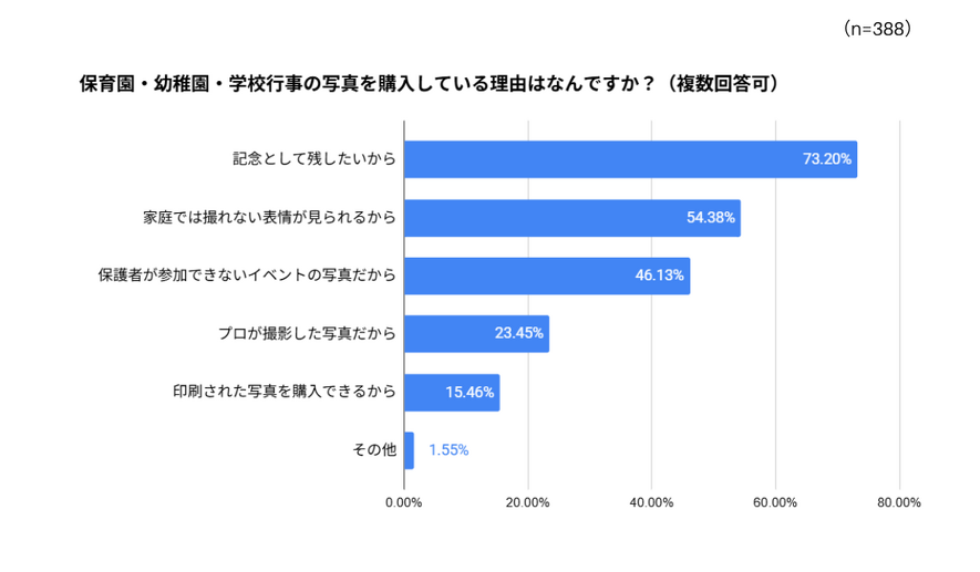 購入する理由としては、「記念として残したいから」が73.20%でトップとなり、次いで「家庭では撮れない表情が見られるから(54.38%)」、「保護者が参加できないイベントの写真だから(46.13%)」と続きました。寄せられたコメントも、「私では撮れない躍動感やお友達とのおどけた表情、とてもありがたいです。」など、プロや先生が撮る写真ならではの価値を感じている方が多いようです。