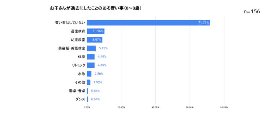 現在3歳以下のお子さんはまだ習い事を経験していないという方も多くいらっしゃいました。習い事をされている方の中では「通信教育」「幼児教室」などの学習系の習い事が多いようです。