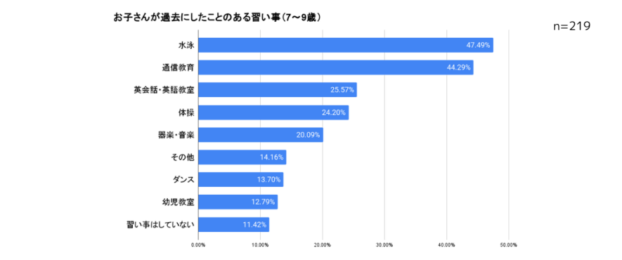 7歳以上、小学校入学後のお子さんになると、「水泳」「通信教育」をされたことがある方の割合がさらに増えていきます。お子さんの成長に合わせて、習い事を選ばれている様子が分かりますね。