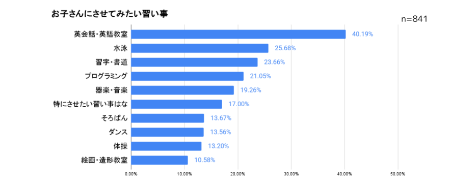 最後に、今後お子さんに挑戦させてみたい習い事についても聞いたところ、「英会話・英語教室」が1位となりました。「小学校でも必修になり、中高大と今後を見据えると役立つと思うから。苦手意識を無くせるように。」といった、先取り学習としての需要があるようです。