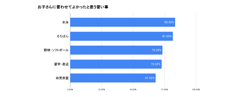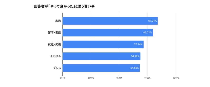 お子さんに対しても「やったことがある」人のうち、「習わせてよかった」習い事の割合を調べました。こちらも1位は「水泳」で8割以上の人が「習わせてよかった」と回答し、人気の高さが伺えます。「そろばん」「習字・書道」は大人のランキングでも上位でしたが、どの習い事も、本人が「やってよかった」と回答した割合より高い結果となりました。