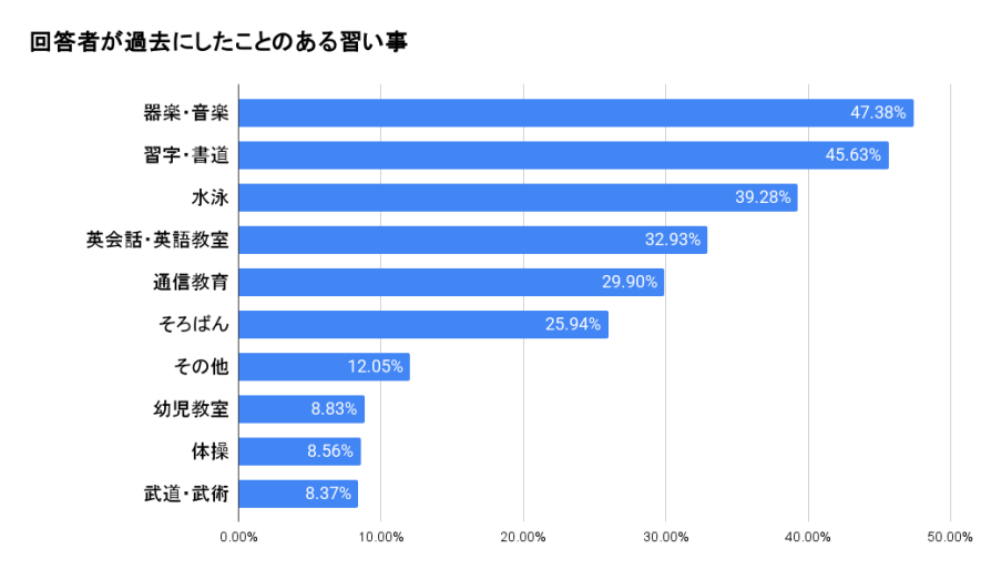 まずはヨメルバ会員本人が子どもの頃にしたことのある習い事を調査。最も多かったのは、ピアノなどの「器楽・音楽」系の習い事で、半数近くの方がやった事があると回答。後述する「お子さんがしたことのある習い事」では少なかった「習字・書道」と「そろばん」が上位に入り、「習字・書道」は半数近く、「そろばん」は4人に1人がやったことがあるという結果になりました。