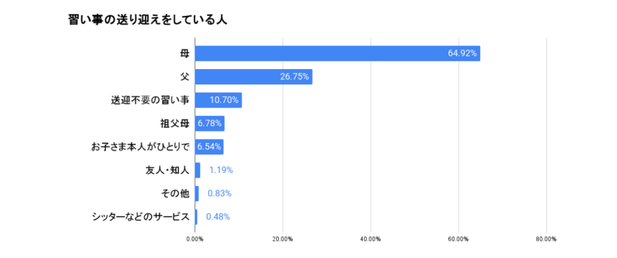 習い事をやるにあたって避けられないのがお子さんの送り迎え。お母さんが送り迎えをするという方が最も多くなりました。近年は送り迎えをしてくれるサービスもあるようですが、利用している人はまだまだ少ないようです。