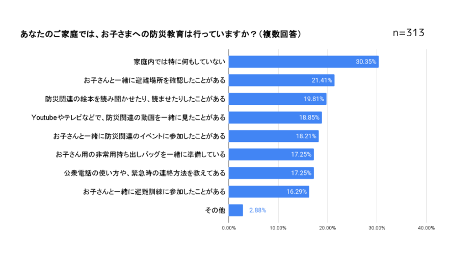 以上、“防災”についての調査結果をご紹介しました。避難訓練などの防災関連のイベントや、ニュースなども増えてくるこの時期に、ぜひご家族で防災について話し合ってみてはいかがでしょうか。