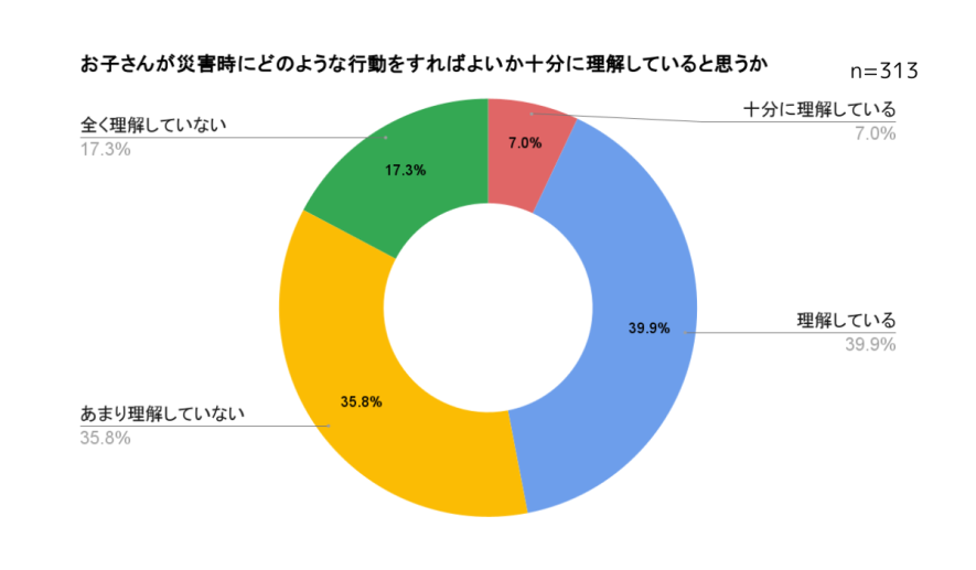 続いてお子さんの防災事情についても調査しました。災害時の行動について「十分に理解している」「理解している」は46.9%、「あまり理解していない」「全く理解していない」が53.1%と、理解していないお子さんがやや上回る結果となりました。
