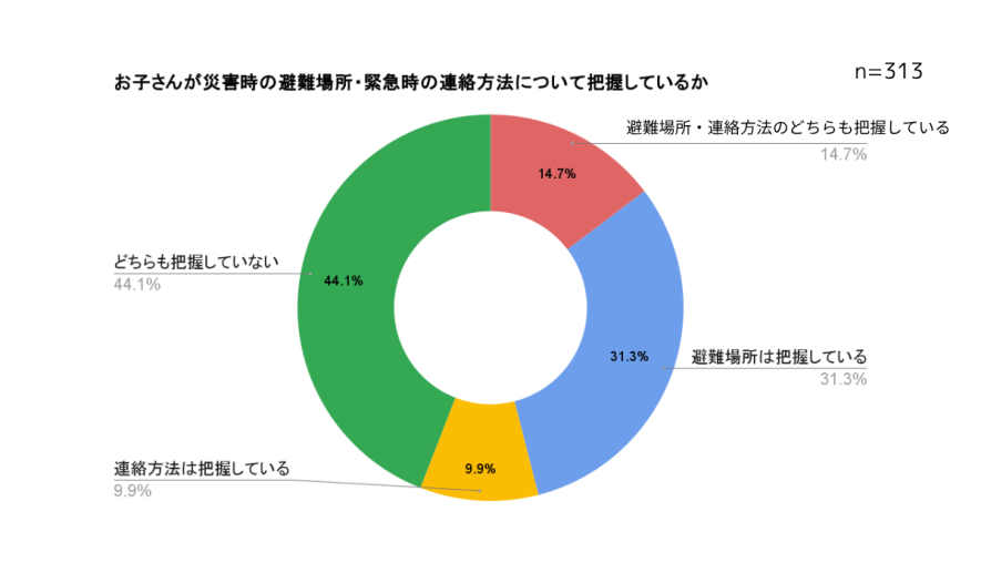 具体的な避難場所やご家族との連絡方法について、どちらもお子さんが把握していると回答された方は15%弱に留まりました。一方で「どちらも把握していない」という回答は4割を超える結果に。もちろんお子さんの年齢によってはまだ難しいという方も多いと思いますが、防災の日をきっかけに、親子で確認してみてはいかがでしょうか。