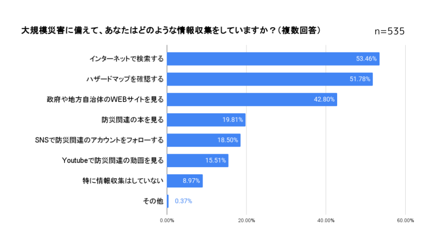 大規模災害に備えた情報収集に関しても調査しました。「特に情報収集はしていない」と答えた人は約9%に留まり、9割以上の人が何らかの情報収集をしていることが分かりました。方法としては、「インターネットで検索する」が53.5%、「ハザードマップを確認する」が51.8%と多く、いずれも半数以上の回答を集めました。続いて「政府や地方自治体のWEBサイトを見る」が42.8%と多く、お住まいの地域に関する情報を集めている様子がうかがえます。ハザードマップを含め、近くの避難所の情報なども政府や地方自治体のWEBサイトで確認することができます。まだ確認したことがないという方は、この機会にぜひチェックしてみてください。