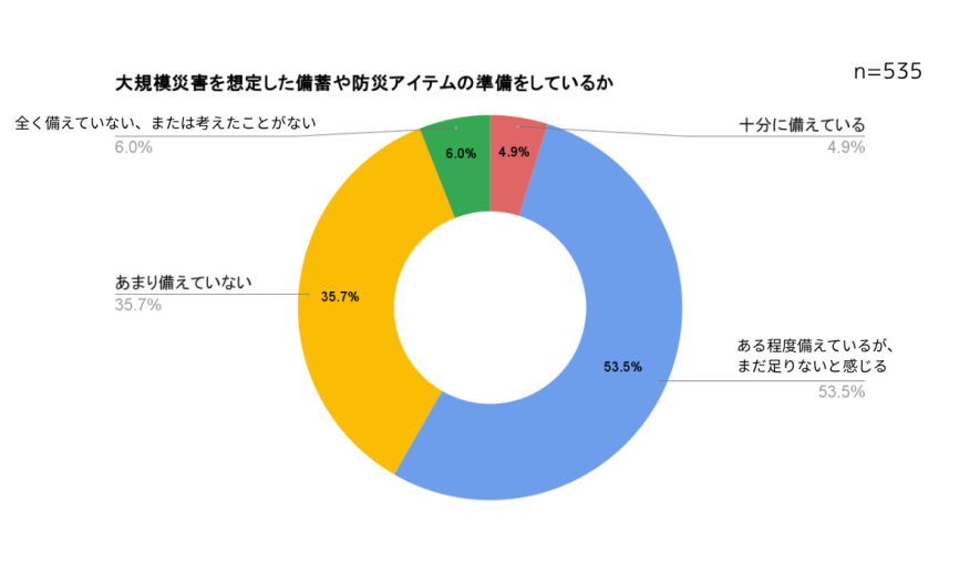 まずはご家庭での現在の備えについて訊いてみたところ、「十分に備えている」と回答した人はわずか5%程度で、ほとんどの人が十分に備えているとはいえない状況のようです。「ある程度備えているが、まだ足りないと感じる」は53.5%と最も多く、「十分に備えている」と合わせて6割近くの人が何らかの準備はしているものの、その多くが十分ではないと感じていることが分かりました。一方で「あまり備えていない」「全く備えていない、または考えたことがない」人は合わせて約4割と、少なくない結果になりました。
