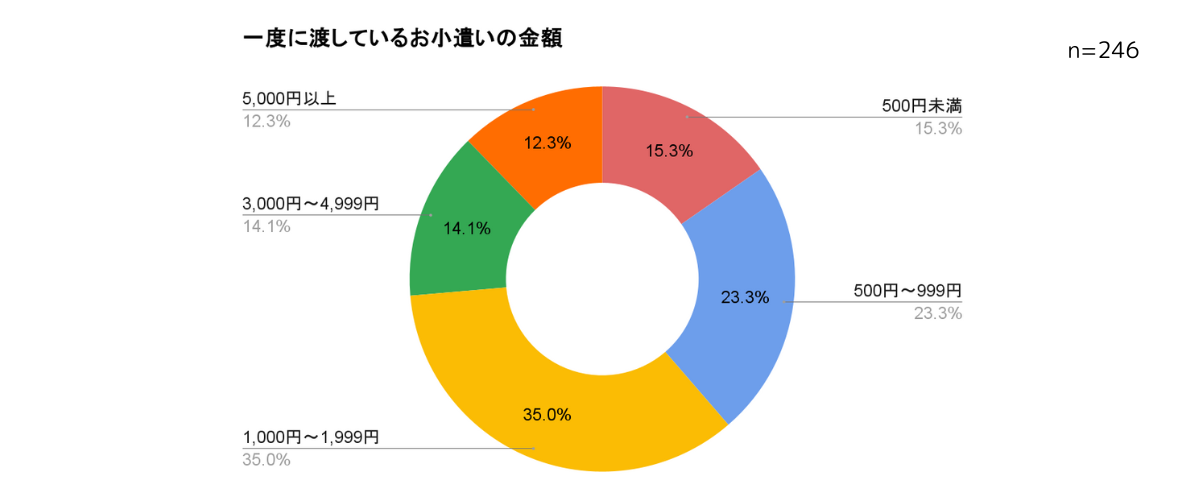 1,000円未満が約40%、1,000円台が35%と、2,000円以下がボリュームゾーンとなりました。もちろんお子さんの年齢が上がるにつれて金額は上がっていくようで、11歳までは半数以上が1,000円でしたが、12歳以上になると85%以上の方が1,000円以上という結果でした。