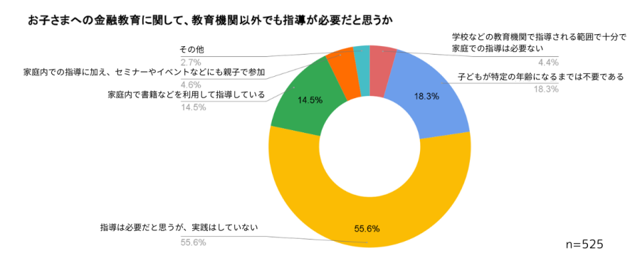 最後に「金融教育」に関する考えや行動について調査しました。最も多かったのは「指導は必要だと思うが、実践はしていない」という方で半数以上でしたが、すでにご家庭で指導をしているという方も20%いらっしゃいました。「子どもが特定の年齢になるまでは不要である」という方も含めると、90%以上の方が教育機関以外での金融教育が必要と捉えているようです。
