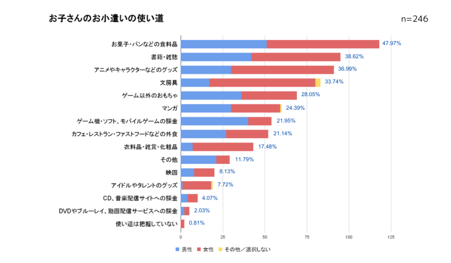 気になるお小遣いの使い道ですが、最も多かったのは「お菓子・パンなどの食料品」でした!手頃な価格で楽しめるというのも理由かもしれませんね。続いて「書籍・雑誌」「アニメやキャラクターなどのグッズ」「ゲーム以外のおもちゃ」といった趣味に関連する物が並びました。「ゲーム機・ソフト、モバイルゲームの課金」は男の子、「衣料品・雑貨・化粧品」や「文房具」は女の子の割合が多いようです。