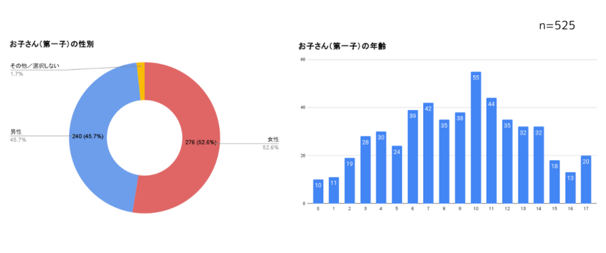 今回のアンケートでは、17歳までのお子さんがいるヨメルバ会員525人から回答をいただきました。お子さん(第一子)の年齢は小学生が中心ですが、未就学から高校生まで幅広い年齢のお子さんについて回答いただいています。以下のアンケート結果は、年齢をお答えいただいた第一子のお子さんについて回答いただいたものになります。早速結果を見ていきましょう。