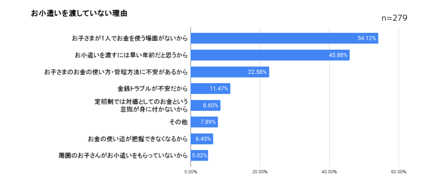 続いてお小遣いを渡していない理由についても見てみましょう。1位は「お子さんが1人でお金を使う場面がないから」、2位は「お小遣いを渡すには早い年齢だと思うから」という結果になりました。お子さんの年齢別にみると、8歳以降で「お小遣いを渡すには早い年齢だと思うから」を選ぶ方が大きく減る結果となり、やはり7歳くらいからがお小遣いを渡すのにふさわしい年齢だと思っている方が多いようです。