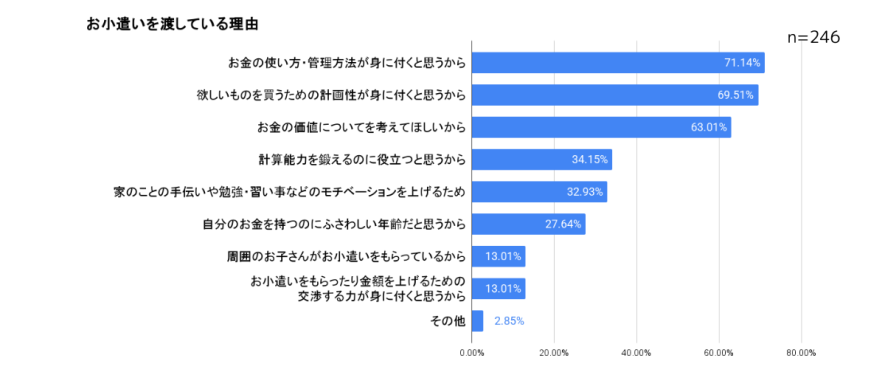 お小遣いを渡している理由の上位は「お金の使い方・管理方法が身に付くと思うから」「欲しいものを買うための計画性が身に付くと思うから」で、どちらも約70%という結果でした。続いて「お金の価値について考えてほしいから」が3位に。前述の「お小遣いの渡し方別」に理由を見てみましたが、「お手伝いなど、決められた条件を達成した際に渡している」方で、「家のことの手伝いや勉強・習い事などのモチベーションを上げるため」という理由を選んだ割合が少し高めだったほか、渡し方と理由に大きな関連は見られませんでした。