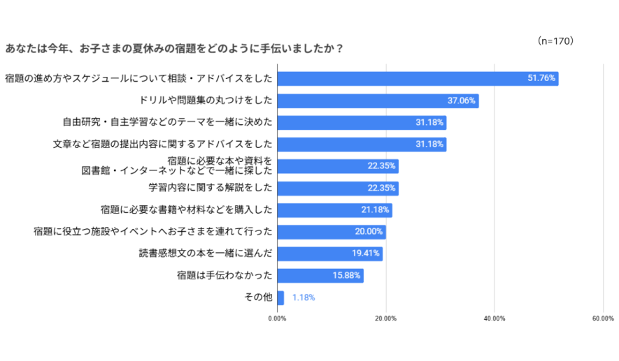 最も多かったのは「宿題の進め方やスケジュールについて相談・アドバイスした」というもので、半分以上の方が回答されました。どの宿題をいつまでにやるか、時間がかかる宿題はどうやって進めるか、といった、お子さんにはなかなか難しい進捗管理の部分を手伝った保護者の方が多かったようです。また、出された宿題として最も多かった「ドリル」も保護者の方への影響が大きいようで、「ドリルや問題集の丸つけをした」という方も37%に上りました。
