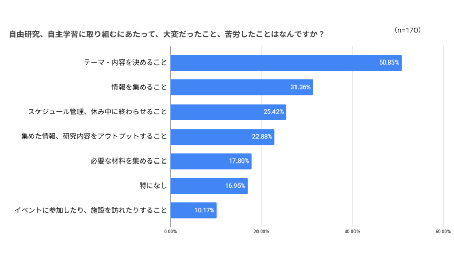 続いて、具体的な宿題についても調査を行いました。まずは自由研究・自主学習を行う際に大変だったこと、苦労したことを聞いたところ、「テーマ・内容を決めること」が半数以上で1位となりました。2位になった「情報を集めること」に関しては、「インターネットの情報を集めてまとめるだけだと、それなりに時間も労力もかかる割に、本当に質の良い学びになっているのか疑問に感じてしまいました。」というコメントも。どうやって情報を集めるか、どう学びにつなげるかというのは気になるポイントですよね。