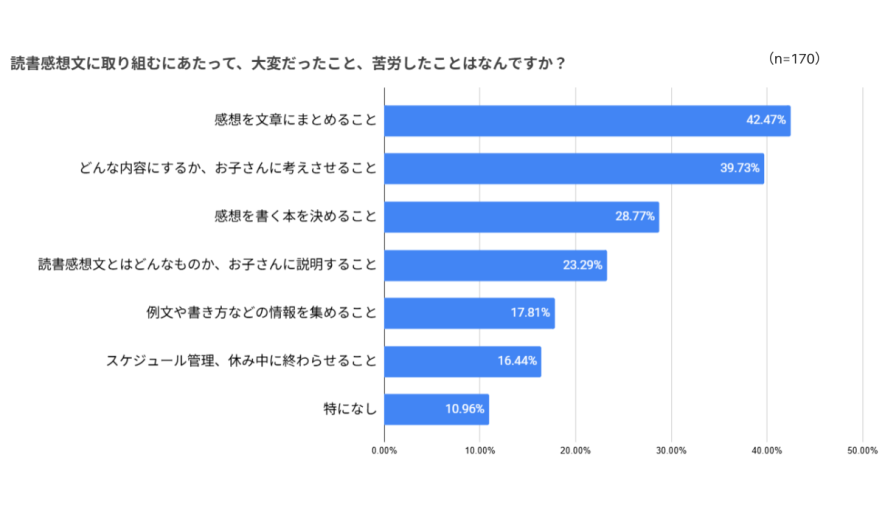 「とにかく読書感想文を仕上げるのに時間がかかりました。学校でそこまで文を書く練習をしていなかったこともあり、構成や文作りがとっても大変でした。ある程度学校で練習や慣れがいると思います。」や、「子どもは本を読むことは大好きなのですが、読書感想文を書くことがまだ1人では出来ないので、私も何度も子どもが寝たあとに本を読み返しました。子どもにも何回か読んでもらい、感想を聞いたり特に記憶に残っていることなどを聞き出し、要約することが大変でした。そして、低学年のときより原稿用紙の枚数が増えるので内容を深めて書くのに苦労しました。まだまだ一緒に取り組む必要があると感じました。」など、本が好きで読むことはできても、内容を考えてアウトプットすることの難しさについてコメントされた方が多くいらっしゃいました。