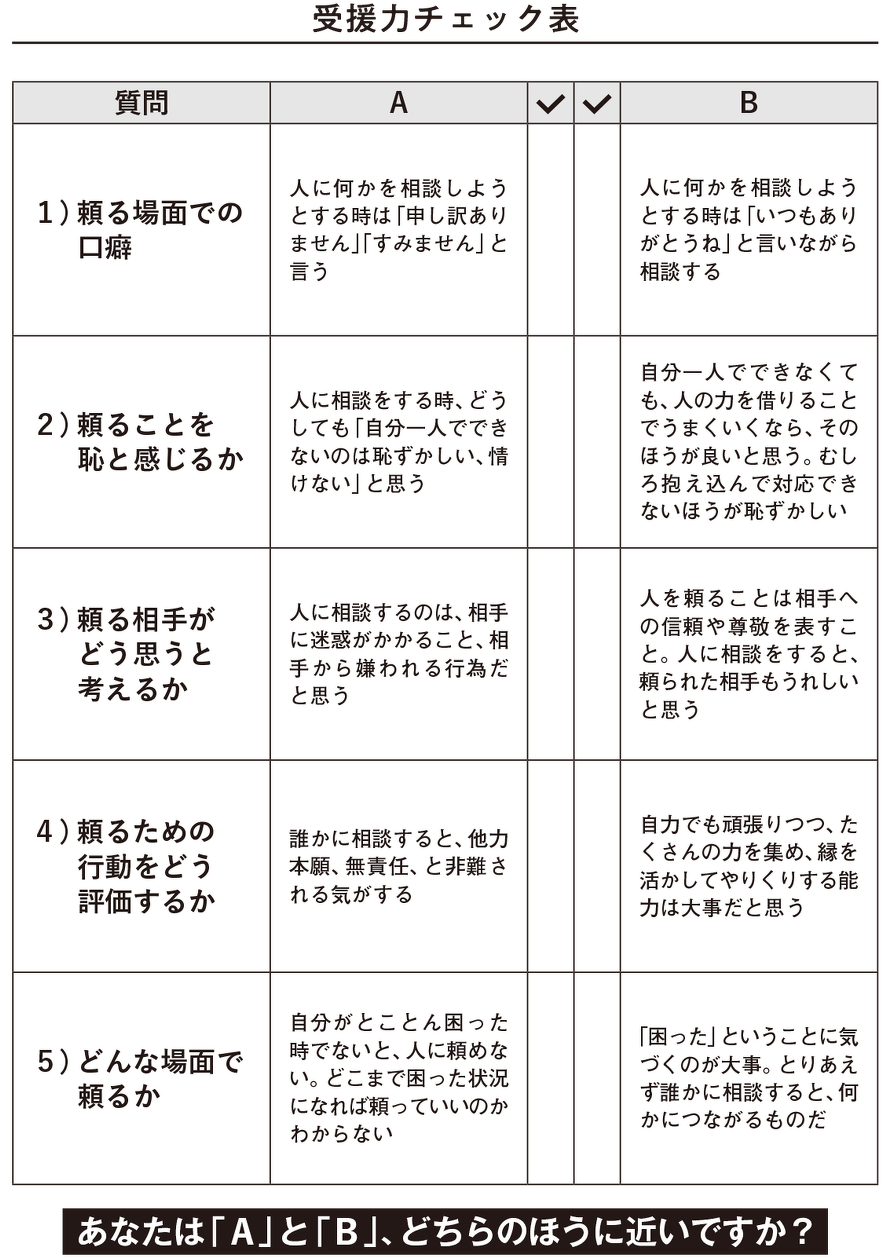 いかがですか? これらのチェック項目はもちろん、受援力の一部を切り取ったものにすぎません。正解も不正解も点数による評価もありませんし、「A、Bのどっちのほうがいい」といったことを言いたいわけでもありません。でも、5つの選択肢を選んでいく過程で、自分の受援力をある程度可視化することができたのではないでしょうか。