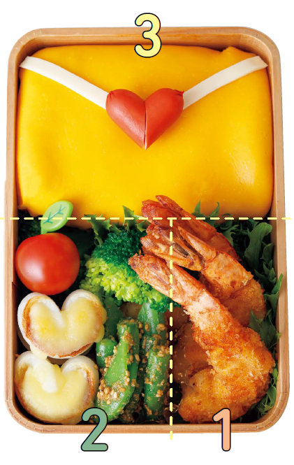 見栄えのいいお弁当のバランスは、主食:[主菜+副菜]=1:1が作りやすいバランスです。まず主食(ご飯、パンなど)をどのように仕切るか決めてから、おかずを詰めるようにします。