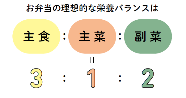 栄養面からお弁当を見た場合、主食:主菜:副菜のバランスは、3:1:2が理想的です。