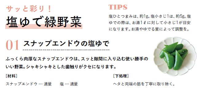 ※作り方は、「c:スナップエンドウの塩ゆで」と同様です。