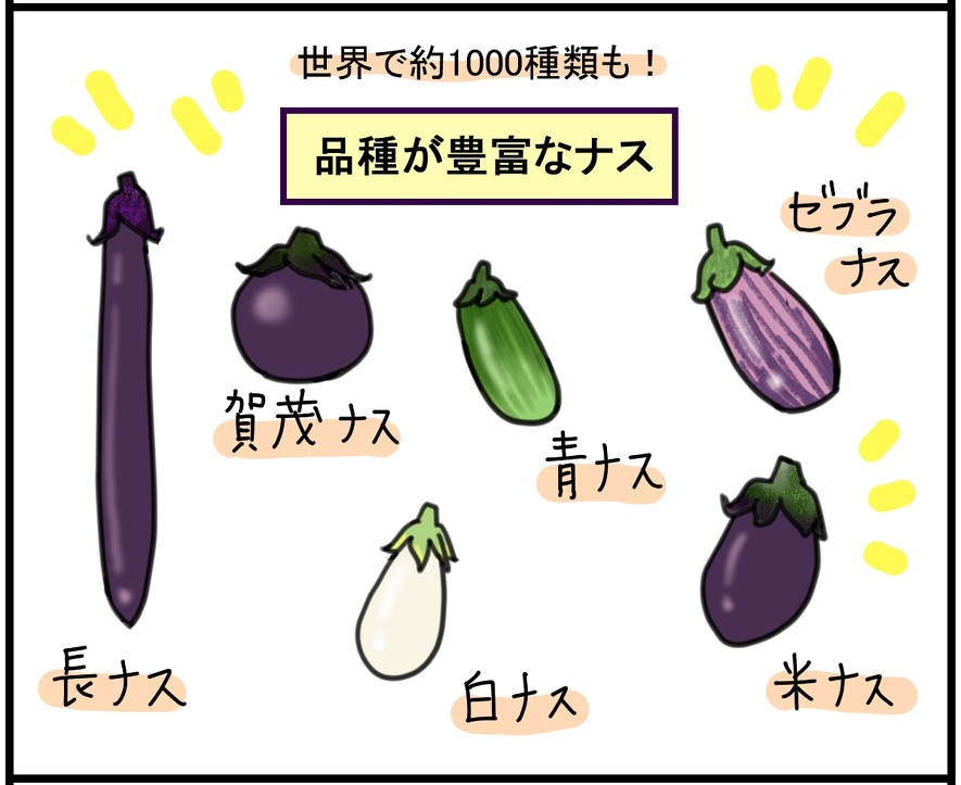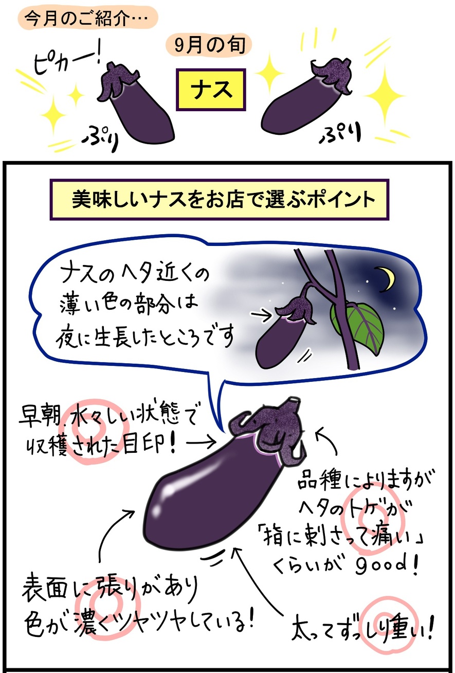 ①ナスのヘタ近くの薄い部分は水々しい状態で収穫された目印!