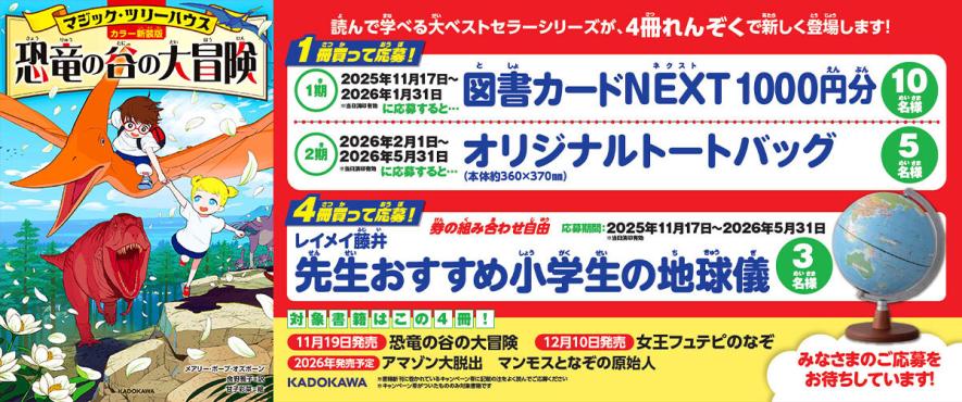 本日、世界累計1億5000万部、40か国で読まれている大人気シリーズ「マジック・ツリーハウス」の新装版第1巻『[カラー新装版]マジック・ツリーハウス 恐竜の谷の大冒険』を発売いたしました。