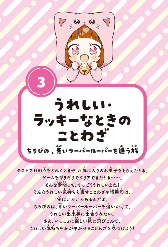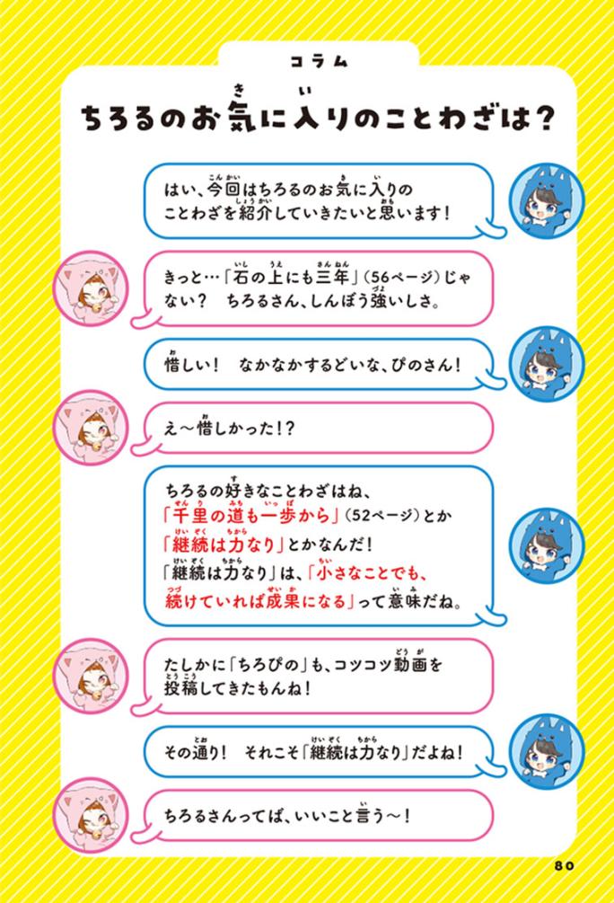 途中のコラムでは「ちろる」と「ぴの」の会話形式で、お気に入りのことわざや四字熟語の紹介も。「ちろぴの」の二人への理解を深めながら、様々な語句を学べる内容になっています。