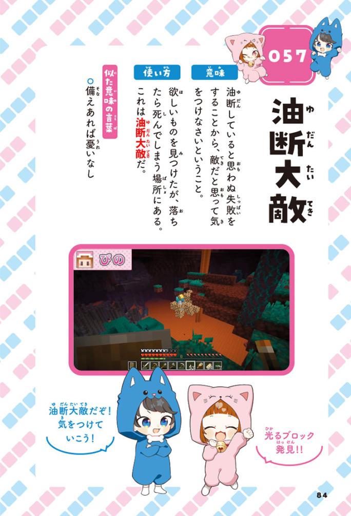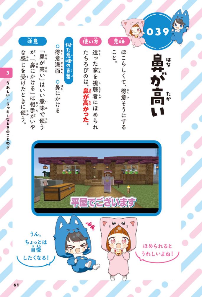 マインクラフトの実況をもとにしたストーリーの中で、100語以上のことわざ・慣用句、四字熟語の意味や使い方を楽しく学べます。また、「ちろる」と「ぴの」のコメントでは言葉の豆知識や使い方のヒントも満載。似た意味の言葉や反対の意味の言葉などの関連語句もセットで学習できます。