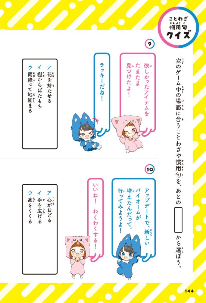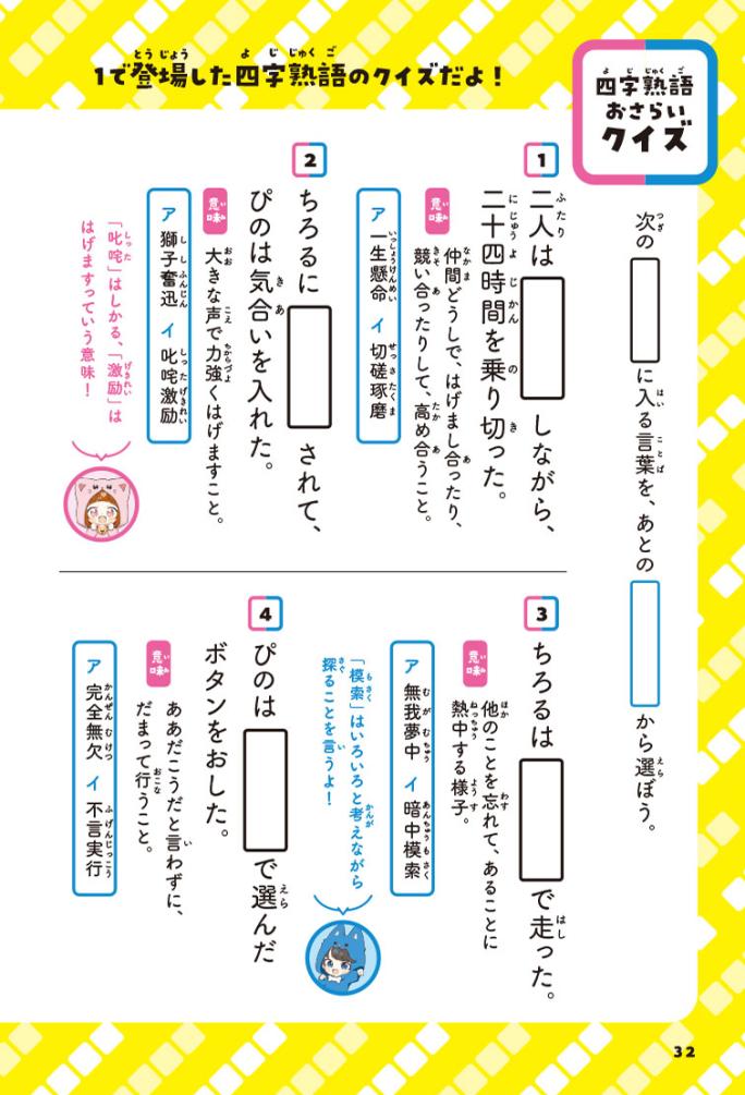 本書の中ではこれまでに学んだことわざや四字熟語をどれくらい覚えているか挑戦できるクイズも掲載。「ちろぴの」2人の会話をもとにしているので、スラスラ読めて楽しくおさらいできます。