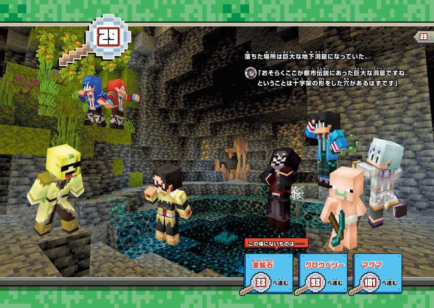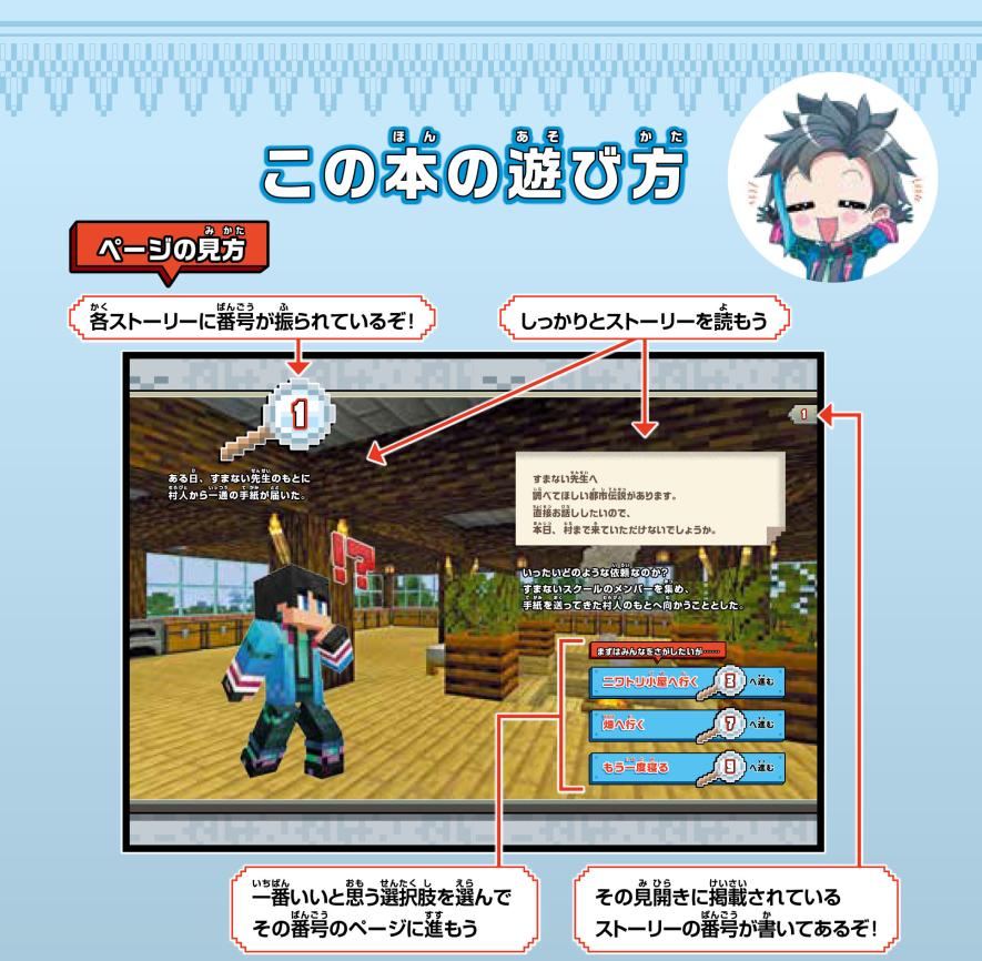 本書ではYouTubeチャンネルのなかでも、人気の高いマイクラ都市伝説シリーズの「生きてる村」や「呪字架の家」を題材とした内容です。