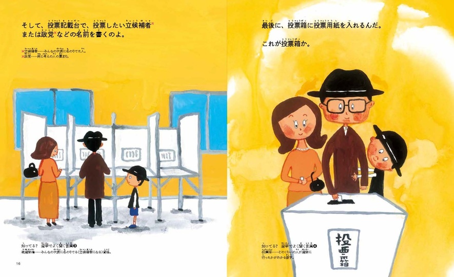 基本的に、絵本は子ども自ら手にするものですが、この本は、大人を介して接する機会が多いのではと思います。学校で教師のかたや司書のかたに「主権者教育」の一環で利用してもらったり、地元の選挙が近くなった際、読み聞かせに利用していただいたり。でも、最も私が強くイメージしているのは、選挙に行ったあと、おうちで家族みんなで読んでもらえたらなあということ。家で当日を振り返りながら、本書をもとにいろいろ語り合ってもらえたらなと思っています。