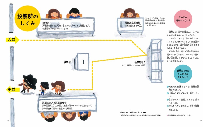 この本を企画したとき、ぜひ実現できればと思っていたのが、投票所の図解です。子どもたちにとって身近な存在ではない投票所を、ビジュアルで解説できればと考えました。そのほか、この本では「そもそも選挙ってなに?」「選挙の4つのたいせつなきまりって?」など、大人が子どもにふと尋ねられて、答えに窮するような選挙の基礎知識も解説しています。この本をきっかけに、家族で選挙について広く語り合ってもらえればと思っています。