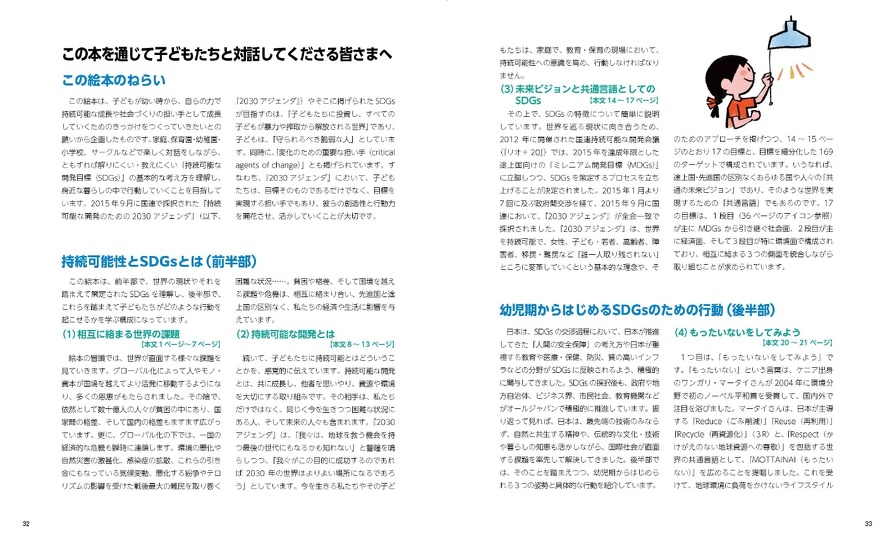 SDGsの17の目標を解説する本は多くありますが、この本では、それがわからないような小さな子どもでも、自分たちで行動できる具体的な例を提案し、子どもたちがSDGsを実践しながら基本理念を理解できるようになっています。