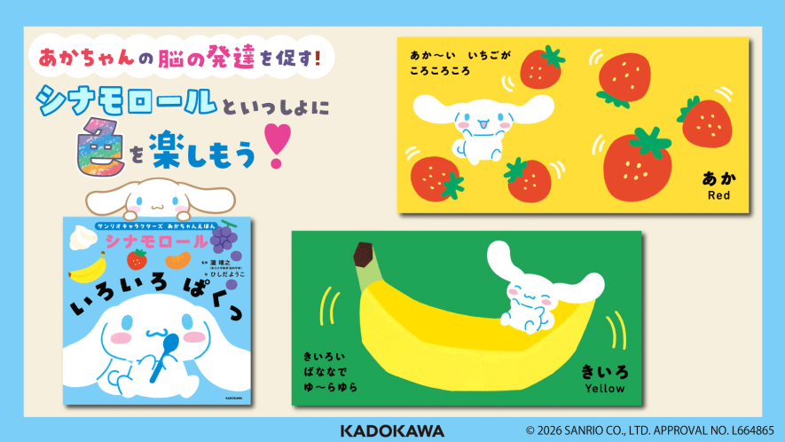 この絵本では、生後6ヶ月までに認識できるようになるといわれている8色を、シナモロールといっしょにリズム感のある言葉で楽しむことで、あかちゃんの好奇心や探求心を刺激し、脳の発達を促します。
