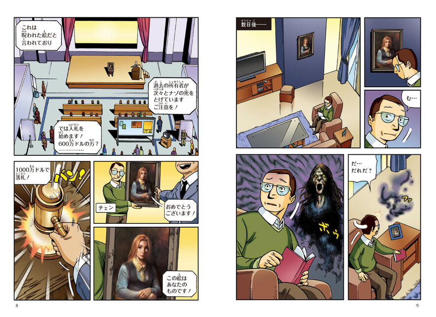 物語はナゾの画家の死、そしてその遺作がオークションで落札されるシーンから始まります。いわくつきの絵を落札した男性。しかしその背後には恐ろしい影が…。本当に恐いストーリーが、子どもを夢中にさせます。