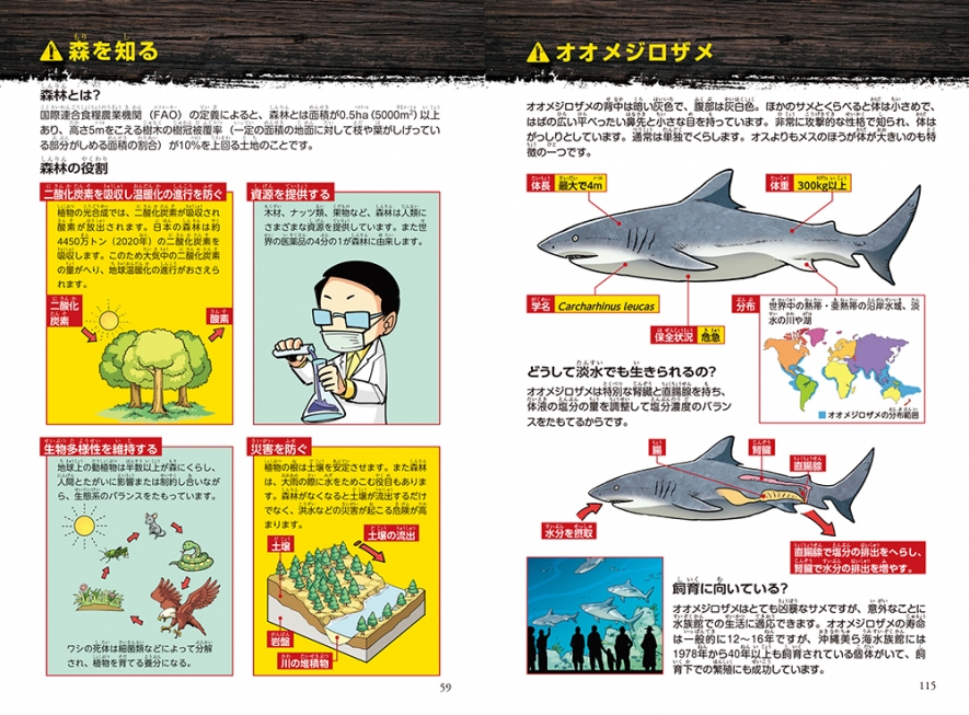 物語の舞台で起こっている環境問題や生き物たちの生態を知るページも充実! 今地球では何が起こっているかを理解し、私たちはどう考え行動するべきかを学びます。