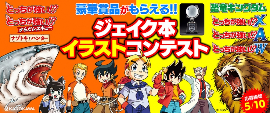 「角川まんが科学・超科学シリーズ」から2・3月刊行予定のジェイク本シリーズ4点を対象に、「ジェイク本イラストコンテスト」が開催中! 動物や恐竜、ジェイク、アレックスなど、ジェイク本に関するイラストだったら何でもOKです。最優秀賞、優秀賞に選ばれた方には豪華なオリジナルグッズをプレゼントします。また、イラストがPOP(本の魅力やおすすめポイントを伝えるパネルやカードのこと)として書店に飾られるかも!? どしどしご応募ください!